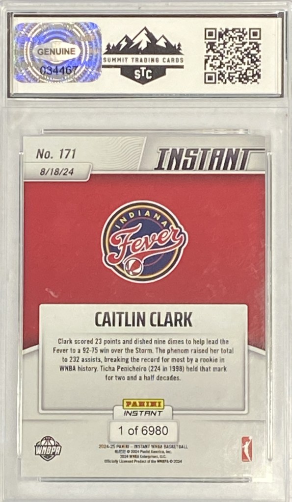 This card commemorates the game that rookie Caitlin Clark broke the rookie assist record with 9 assists against the Storm on August 18, 2024, compiling a total of 232 assists and beating Ticha Penicheiro’s record of 224 assists, which had stood since 1998.