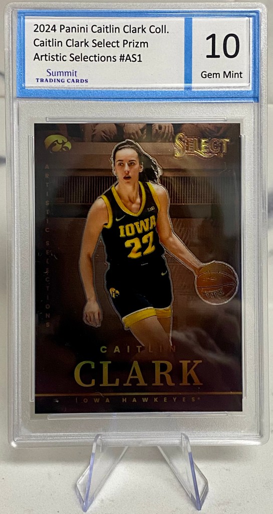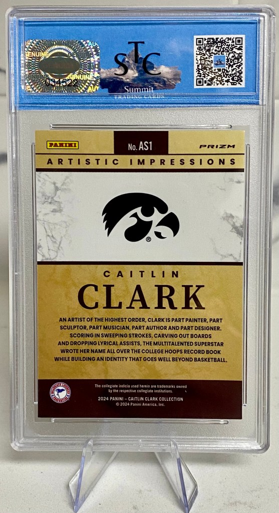 The high-quality Select Prizm Artistic Selections, which oddly has “Artistic Impressions” on the back, has a beautiful antique finish with a deep polished veneer on the front. Caitlin herself stands out in full color against this backdrop in her dark Iowa Hawkeyes uniform. The description on the back likens Caitlin Clark’s court prowess to the talents of a range of artists. Compared to the psychodelic Razzle Dazzle or the multicolored prism Fearless cards, this card has a classic appeal.
