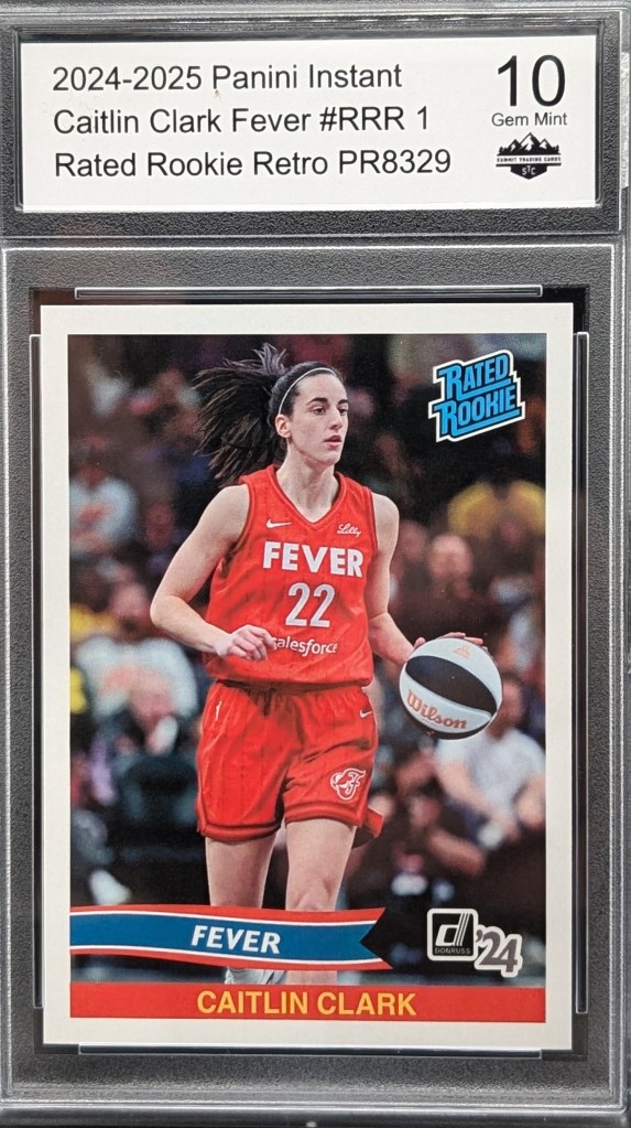 After the 2023-2024 WNBA season, Panini Instant released this set of 14 of the league’s most-heralded first-year class in this exclusive online mini release. The week-long order-to-print netted a print run of 8329 sets. The checklist is headlined by Caitlin Clark, Angel Reese, Rickea Jackson, Aailiyah Edwards, and Cameron Brink. The “Retro” design is based on the 1984 Donruss Baseball Rated Rookies set.